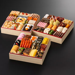 紅白蒲鉾、かつお胡桃、紅白膾 いくらのせ、鰊昆布巻、栗金団、黒豆 紅白千代呂木、小川巻、海老具足煮、煮鮑、蛸柔らか煮、伊達巻、筑前煮 絹さや、銀鮭幽庵焼、数の子、つぶ貝時雨煮