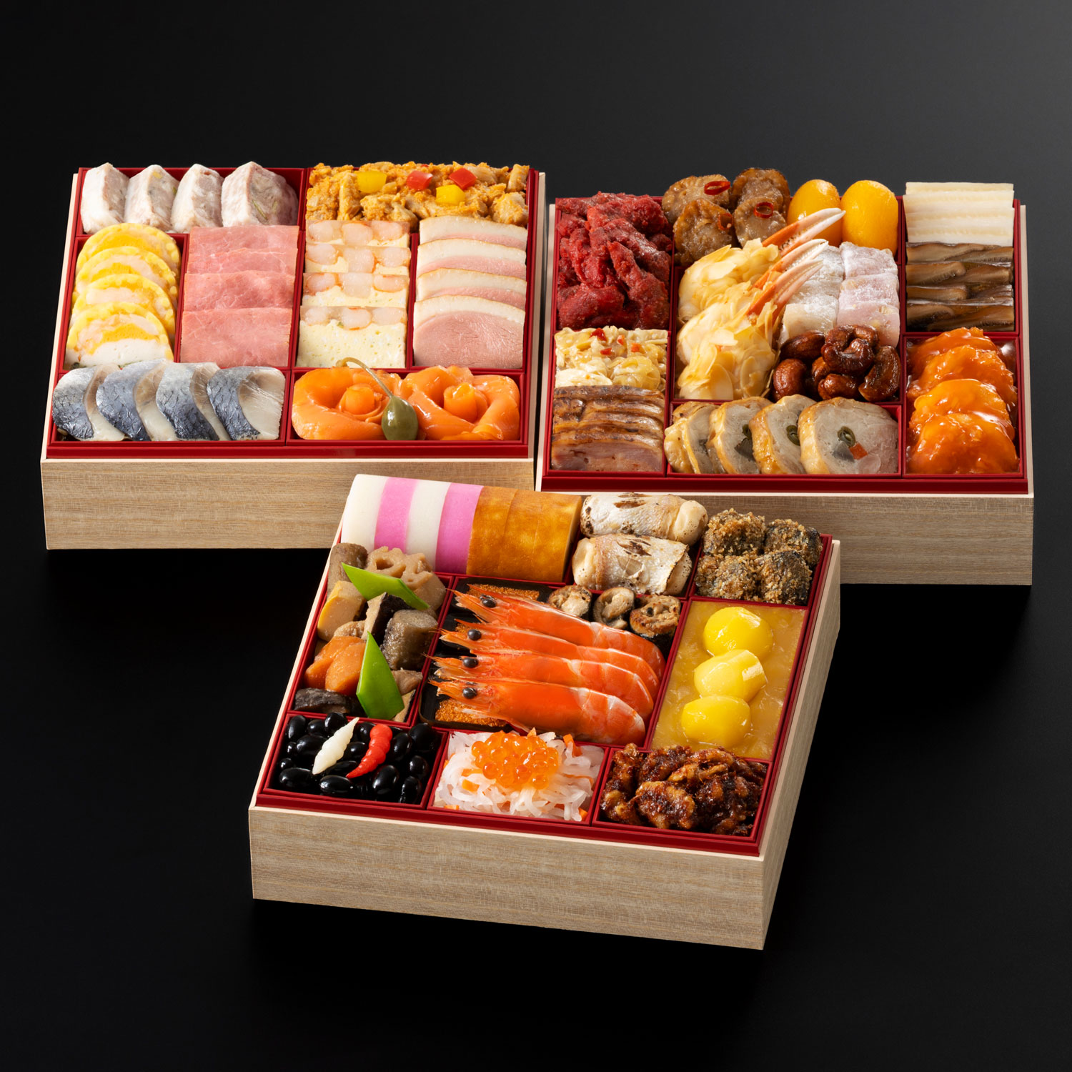 紅白蒲鉾、伊達巻、小鯛俵焼、金胡麻鰯、筑前煮 絹さや、鱈子昆布巻、秋刀魚幽庵焼、海老具足煮、栗金団、黒豆 紅白千代呂木、紅白膾 いくらのせ、かつお胡桃