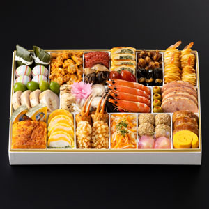 鶏ちまき、手毬餅、タンドリーチキン、蛸柔らか煮、つぶ貝時雨煮、鶏肉のパテ、ドライトマトのコンポート、かつお胡桃、鰊昆布巻、ポテトシュリンプ、若桃ピクルス、鶏肉のモッツァレッラチーズロール、焼き湯葉、紅白菊花漬、秋刀魚のチーズ巻、椎茸旨煮、海老具足煮、スタッフドオリーブ、ベリーロースト、フロマージュ、トマト風味のチーズマフィン、彩り野菜のテリーヌ、蟹さつま揚げ、蟹クルトン揚げ、白身魚のエスカベッシュ、胡麻団子、香り梅、鶏肉の野菜巻き、柚子伊達巻