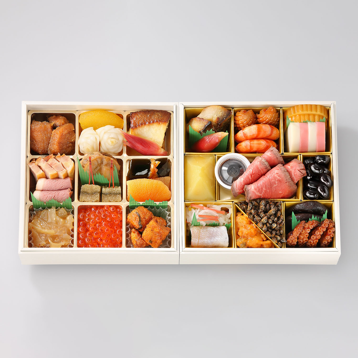 <一段目>伊達巻、紅白小袖蒲鉾、松笠烏賊、海老芝煮、鰆西京焼、酢取茗荷、黒豆、ローストビーフ、ローストビーフソース、栗きんとん、干椎茸甘露煮、小蛸、田作り、貝柱雲丹和え、紅白なます、小鯛笹漬<二段目>鰈西京焼、酢取茗荷、編笠柚子、花百合根、真鱈旨煮、一口昆布巻、数の子鼈甲漬、帆立生姜煮、子持昆布、鶏燻製、合鴨燻製、鱈の子旨煮、いくら醤油漬、海月酢●2人用●箱サイズ:17.9×17.9×5.2cm●商品に含まれるアレルギー特定原材料8品目:小麦、卵、乳成分、えび●お届け日:12月30日(火)1日限り●お届け予定時間:8時~18時※こちらの商品は全国どこにでもお届けいたします。(沖縄・離島を除く)※お届け日時のご指定、ご進物としてのご用向き・二重包装は承れません。※内容が多少変更になる場合がございます。※商品の性質上、お取替え・キャンセル・返品はご容赦願います。※同じ商品でも別々に届く場合がございます。※天候や交通事情などにより遅延等が生じる場合がございます。※盛り付け写真はイメージです。>>1~2人用おせち>>2026年さっぽろ東急百貨店のおせち
