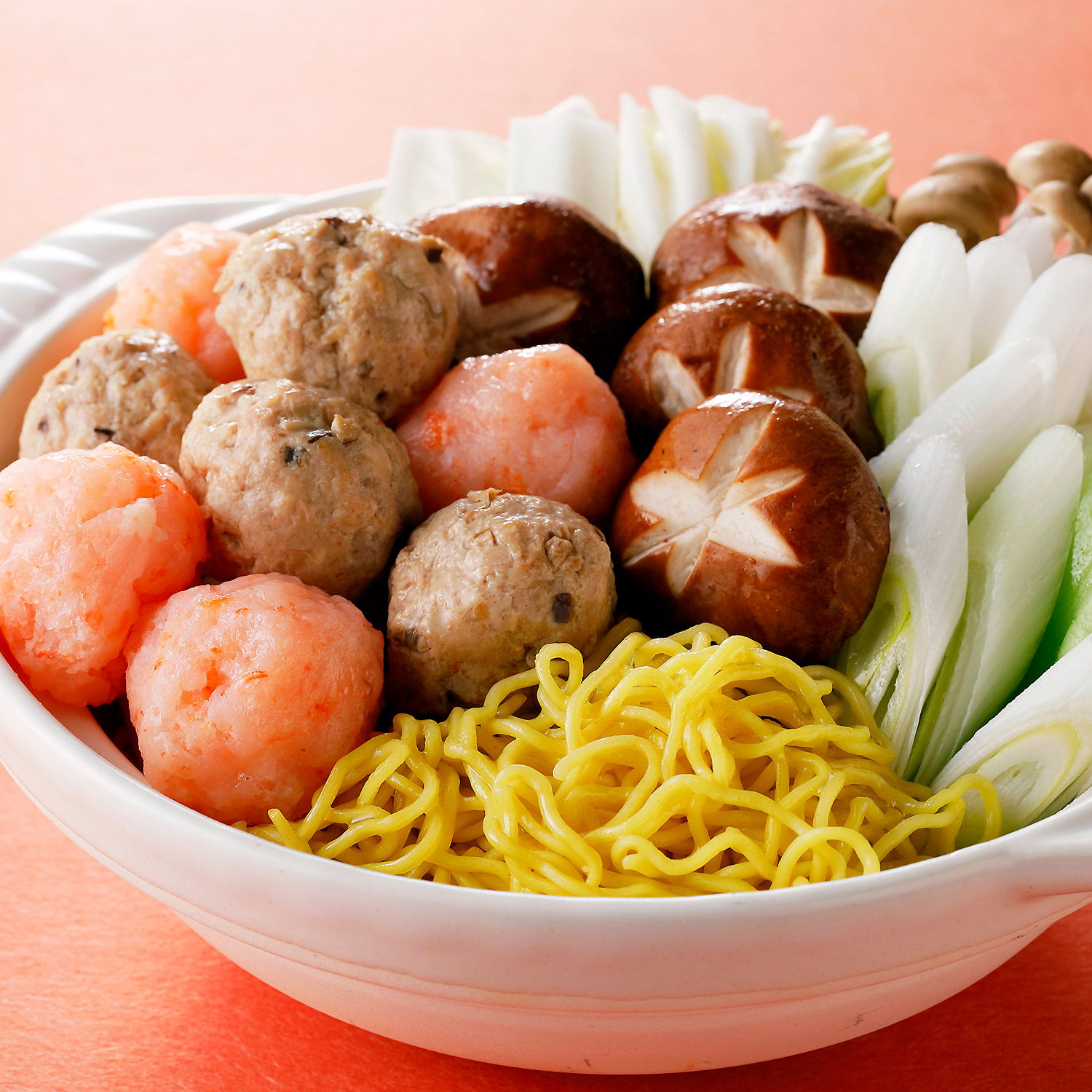 肉団子(4個 120g)、海老団子(4個 120g)、担々スープ(辣油付)、鍋用ラーメン(80g×2)