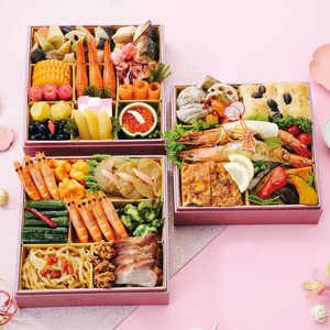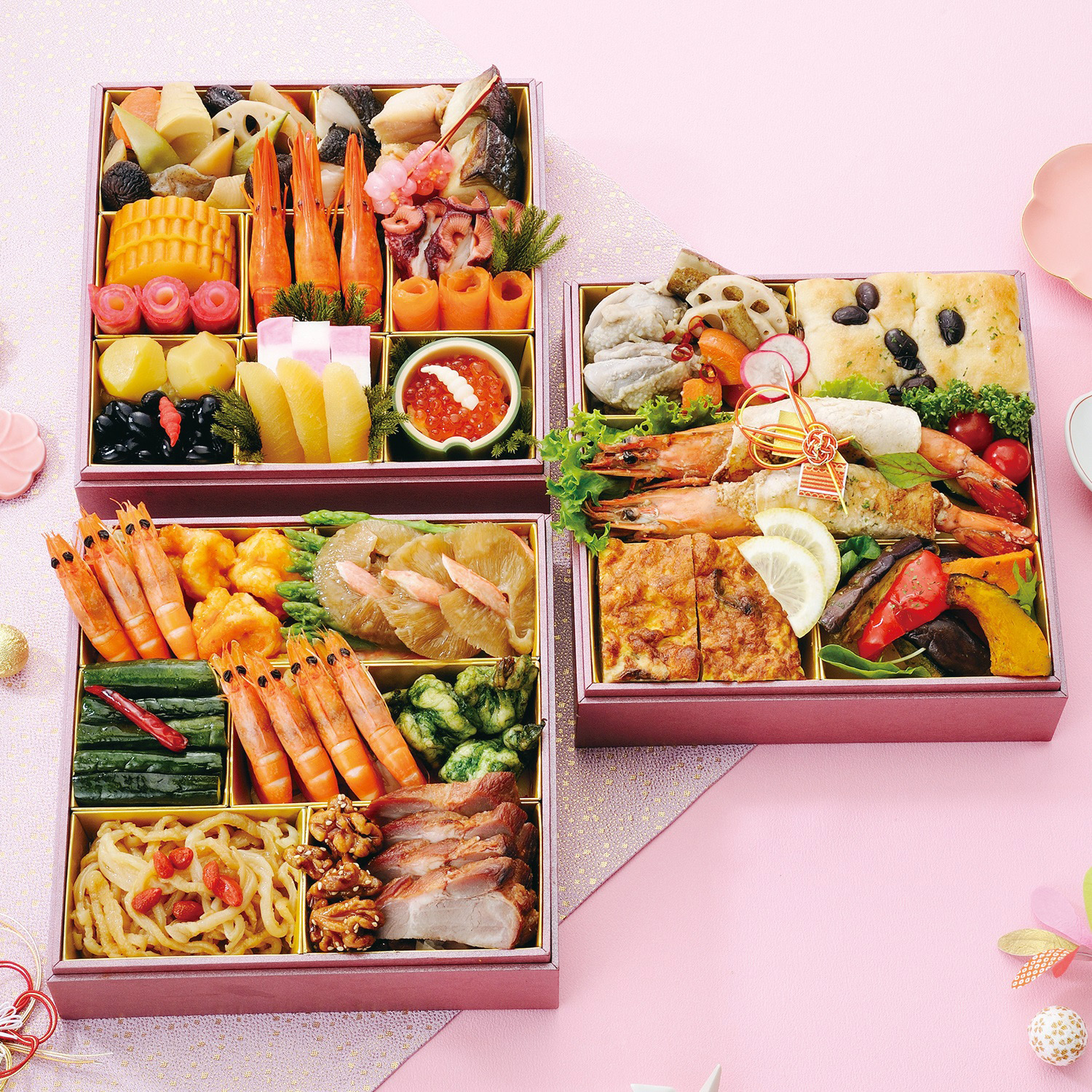さわらの塩麹焼、目抜きの柚庵焼、銀鱈西京焼き、北海しまえび、北海道産たこの柔らか煮、味付け数の子、いくらなます、伊達巻、鯨ベーコン、祝いの筑前煮、スモークサーモン、雪見紅梅、紅白市松蒲鉾、栗金団、北海道産黒豆