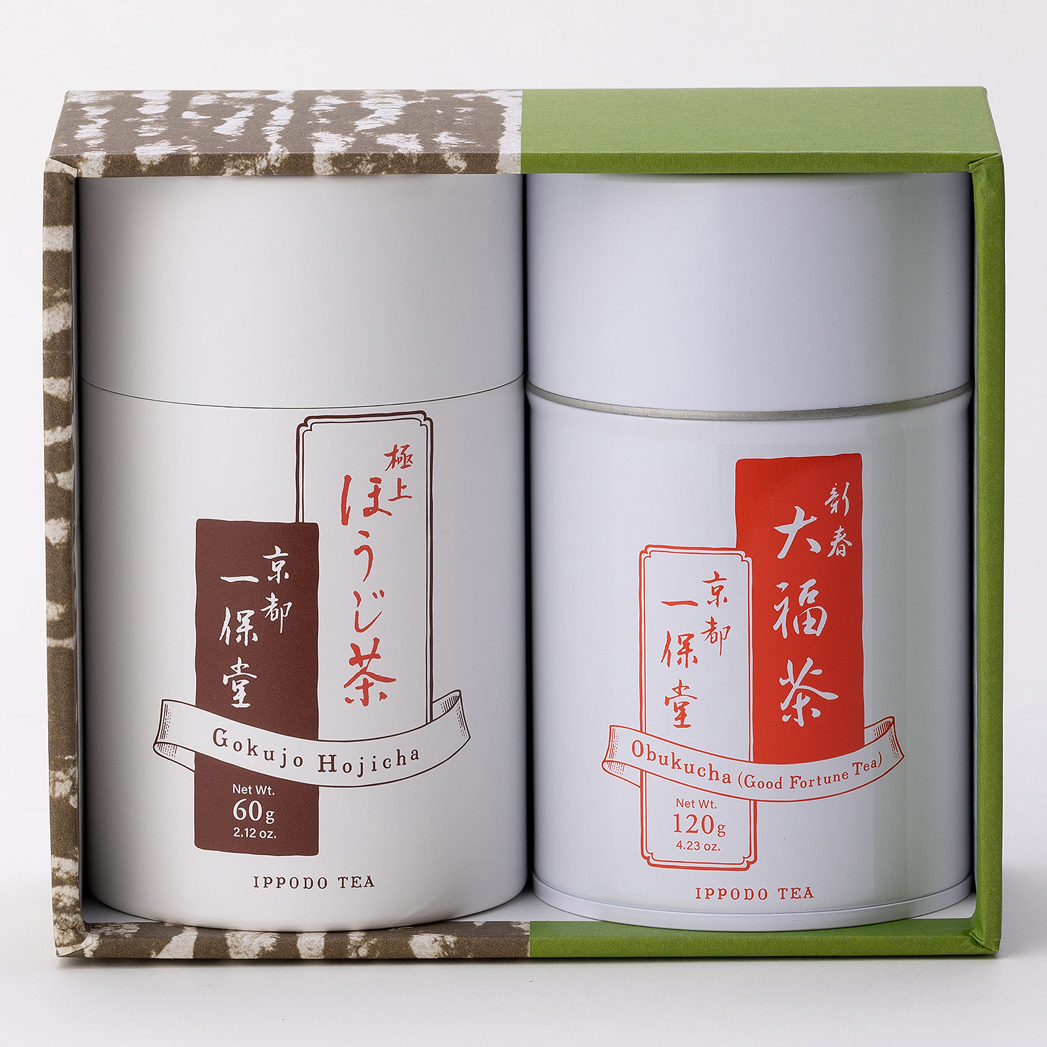 一年の邪気を払い、新年を祝う習わしとして、元旦にいただくお茶を『大福茶(おおぶくちゃ)』といいます。ふんわり広がる玄米の香り。上品ですっきりとした味。特別にお仕立てした玄米茶をお詰めしています。大福茶と一緒に一保堂で人気の極上ほうじ茶を詰合せにしました。