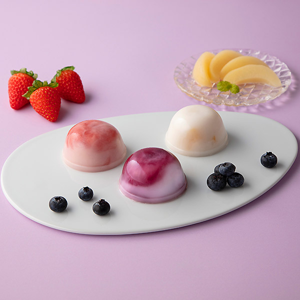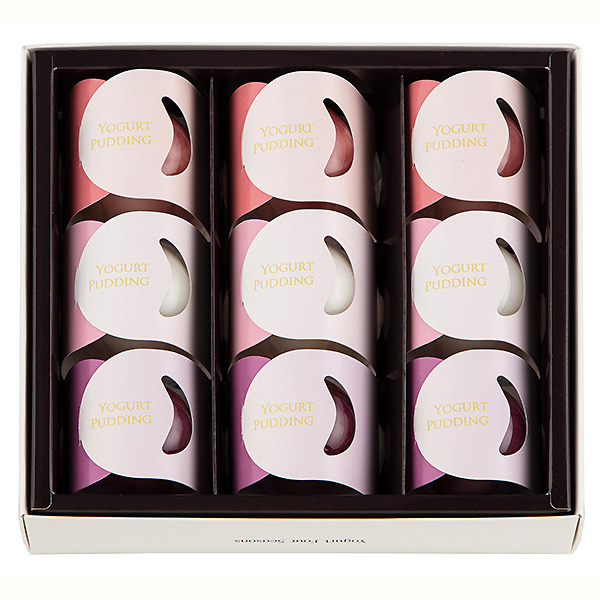 自家製ヨーグルト入りの生地はぷるんとした食感で、ほのかな酸味が広がる優しい味わいに仕上げたミニサイズのヨーグルトプリン。プレーンに白桃の果肉、いちごと秋冬限定のブルーベリーはかわいらしいマーブルに仕上げました。