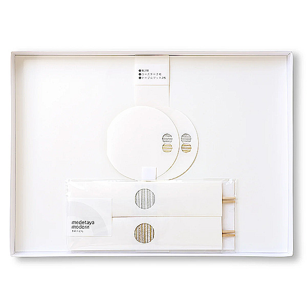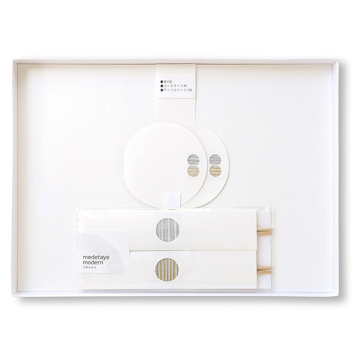 祝箸、コースター、テーブルマット 各2点の箱入りセットです。テーブルマットは生成の和紙の無地。箸包みとコースターは、同じ和紙に水引を取り合わせています。箸包みは金色系と銀色系の各1膳、コースターは金銀の水引を並べた同柄2枚です。ほんの少しざらりとした質感の紙は、カトラリーにも合わせやすく、和洋どちらの雰囲気にもお使いいただけます。ホリデーシーズンから年末年始の華やかなテーブルセッティングにおすすめのセットです。