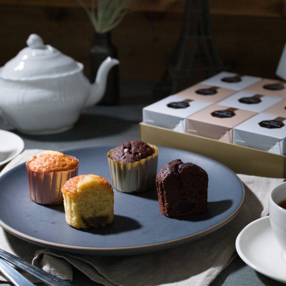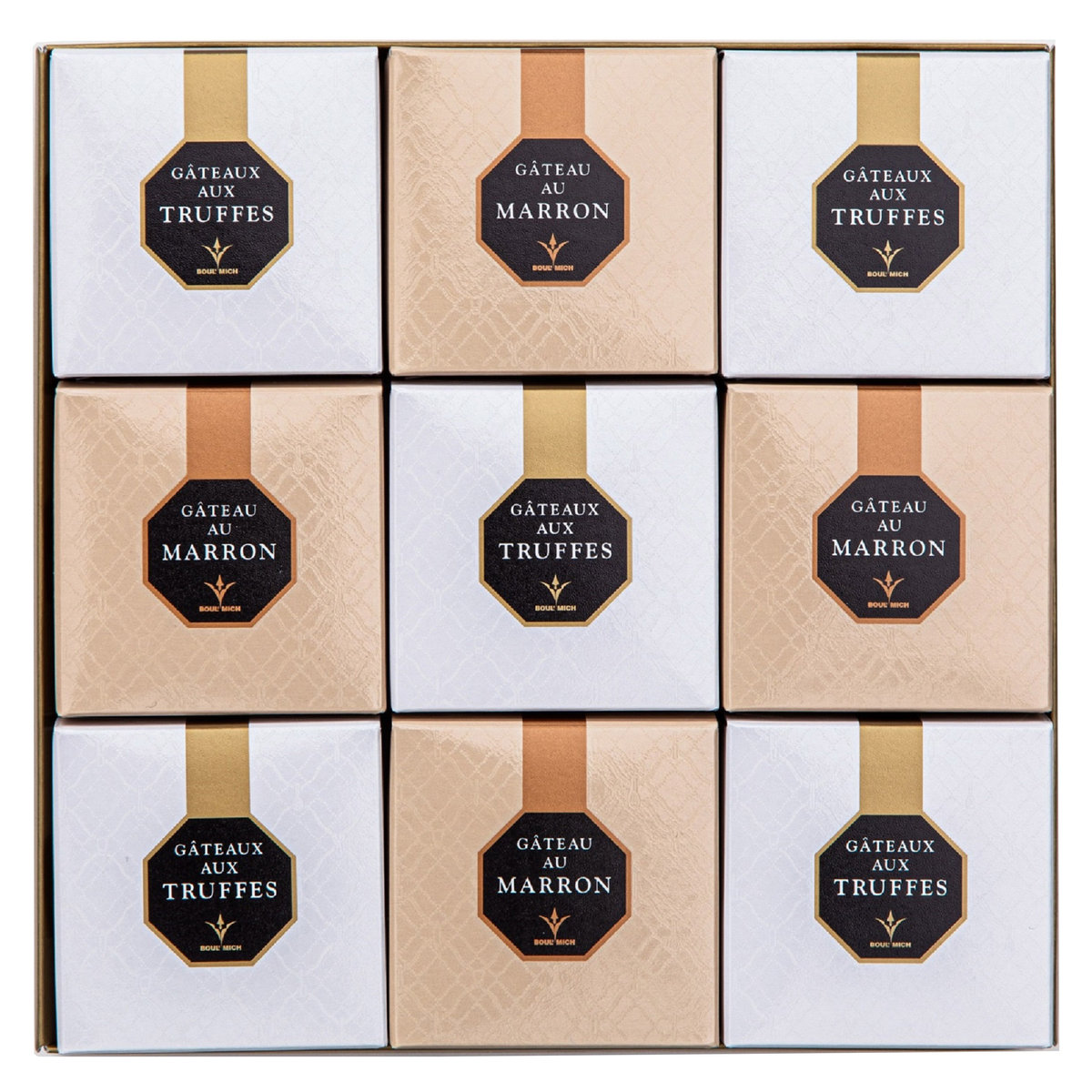 トリュフ・オ・ショコラを一粒閉じ込めた「トリュフケーキ」とマロンの奥深い味わいが広がる「ガトー・オ・マロン」。ブールミッシュの代表的な2つの焼菓子の組み合わせです。
