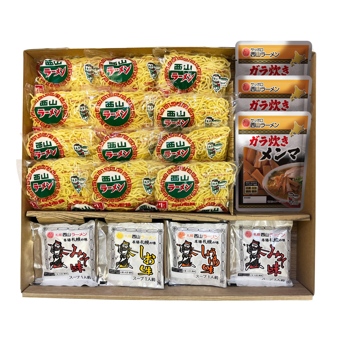 西山定番の味をお楽しみください。長年愛されている西山の麺とスープを詰め合わせました。メンマ付きです。