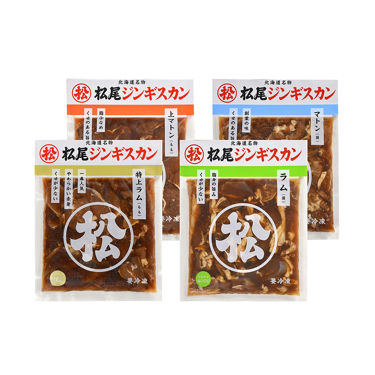 味付ジンギスカンの専門店の草分けとして北海道で愛される≪松尾ジンギスカン≫。人気No.1の味付き特上ラム、1956年創業当時から変わらない味付きマトン。さらに味付きラムと味付き上マトンの4種類の食べ比べセットです。