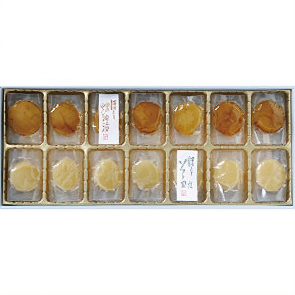 ≪しんや≫のこだわりの帆立貝柱を塩茹でし、美味しさを包み込んだ「ソフト貝柱」と更に軽く燻製をかけた後、極上の植物油に漬け込んだ「ほたて燻油漬」との各7粒詰合せです。帆立の旨味が薫る伝統の一品です。