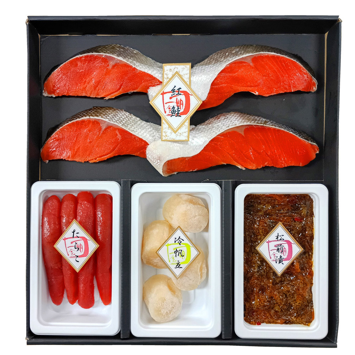 ●内容:紅鮭切身80g×4、たらこ90g、冷帆立貝柱70g、松前漬90g●箱サイズ:29.0×27.0×4cm●商品に含まれるアレルギー特定原材料8品目:小麦●アルコール使用:あり●賞味期限:製造日から冷凍60日>>さっぽろ店のお歳暮 海産物 商品一覧>>さっぽろ店のお歳暮 2025(北海道厳選ギフト) ページ