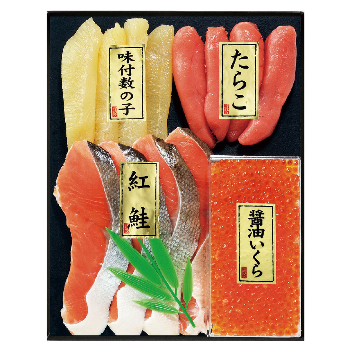 脂の乗った「紅鮭」とまろやかでコクのある「醤油いくら」。薄紅色で程よい塩加減が自慢の「たら子」。味、色、歯ざわり共に輝いている「味付け数の子」のギフトセット。