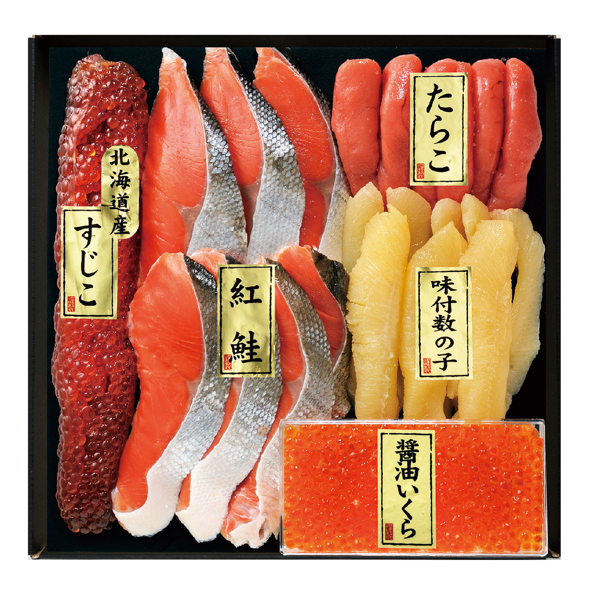 脂の乗った「紅鮭」とまろやかでコクのある「醤油いくら」。甘口でクセのないさっぱりとした「筋子」。薄紅色で程よい塩加減が自慢の「たら子」。味、色、歯ざわり共に輝いている「味付け数の子」のギフトセット。