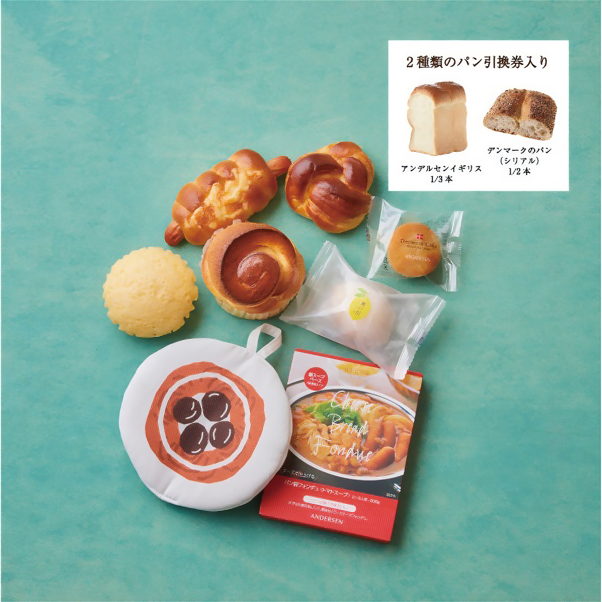 ●内容:アンデルセンイギリス1/3、デンマークのパン(シリアル)1/2・・・引換券、アンデルセンエトランゼ×1、アンデルセンミルクソフト×1、デンマークソーセージロール×1、瀬戸田レモンケーキ×1、陳さんの蒸しパン×1、パン鍋フォンデュ(トマトスープ)×1、デンマークケーキ(広島レモン)×1、鍋敷きミトン×1