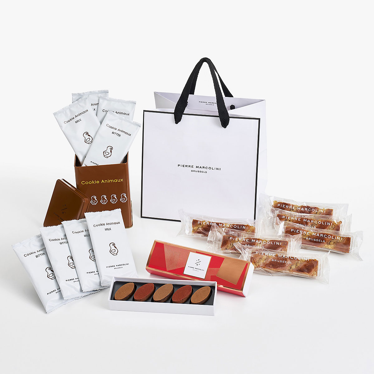 ミルクチョコレートを練り込みしっとりと焼き上げた生地に、レモンピールの歯ごたえと、ふわりと広がる爽やかな香りがアクセントになった「ベイクド ショコラ 瀬戸内レモン」、ピエール マルコリーニの創造性が光る「ガナッシュ ピュール」、チャーミングなアヒルをモチーフにした人気のクッキー「クッキーアニモ」が入ったお得なハッピーバッグです。ピエール マルコリーニの魅力をお楽しみください。