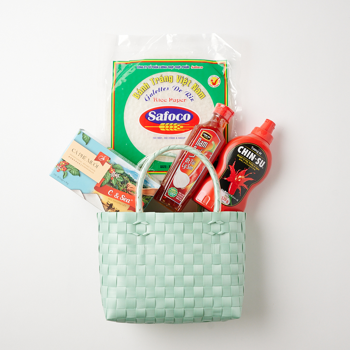 ●内容:チリソース1本、ヌクマム(ベトナム魚醤)1本、ライスペーパー1袋、インスタントコーヒー1箱、パンダン茶1袋