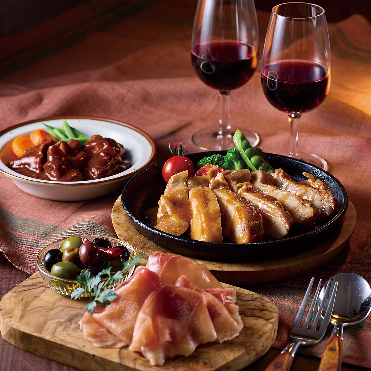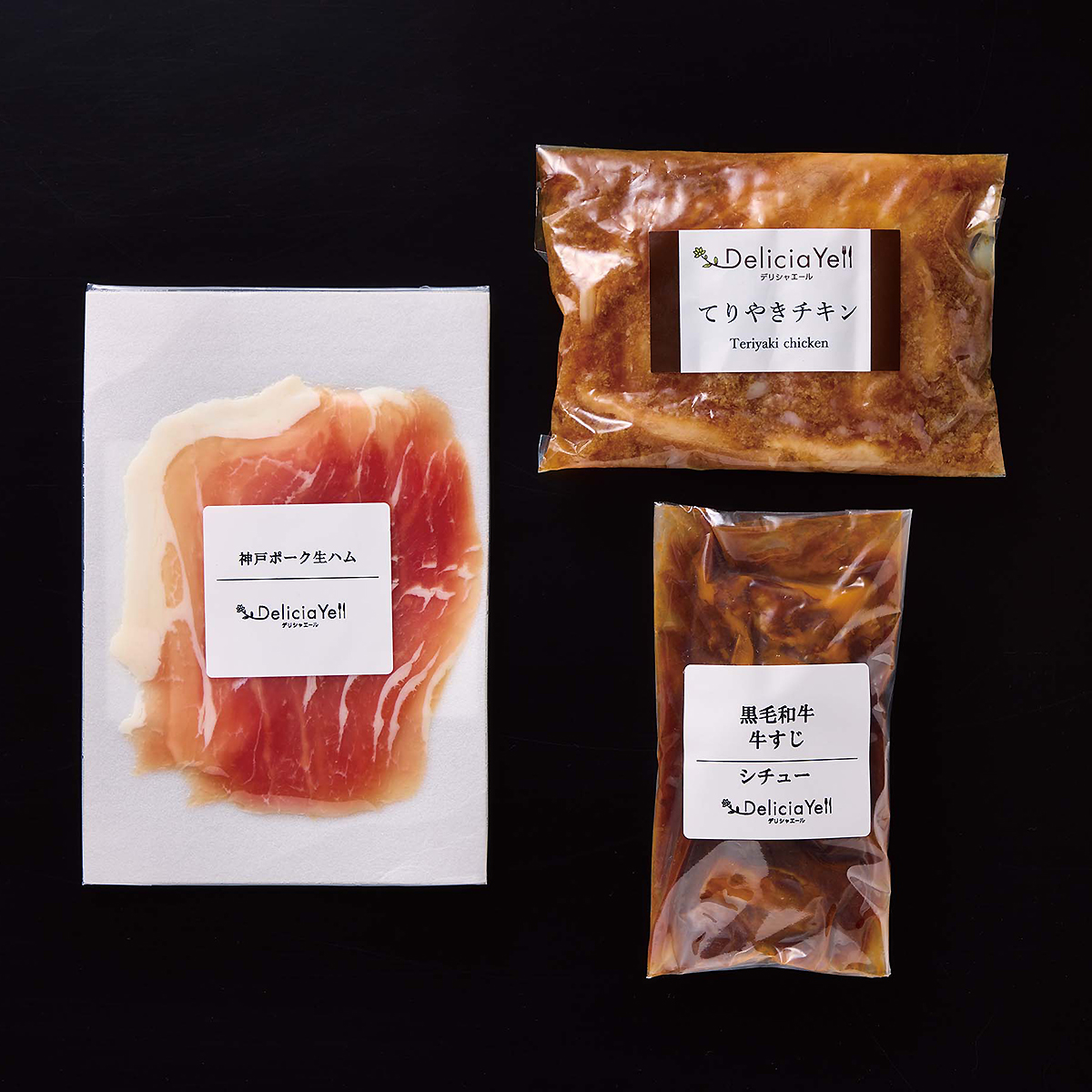 黒毛和牛すじビーフシチュー、神戸ポーク生ハム、照り焼きチキンの3種類のバラエティ豊かな味わいが楽しめるグルメセットです。※画像はイメージです。