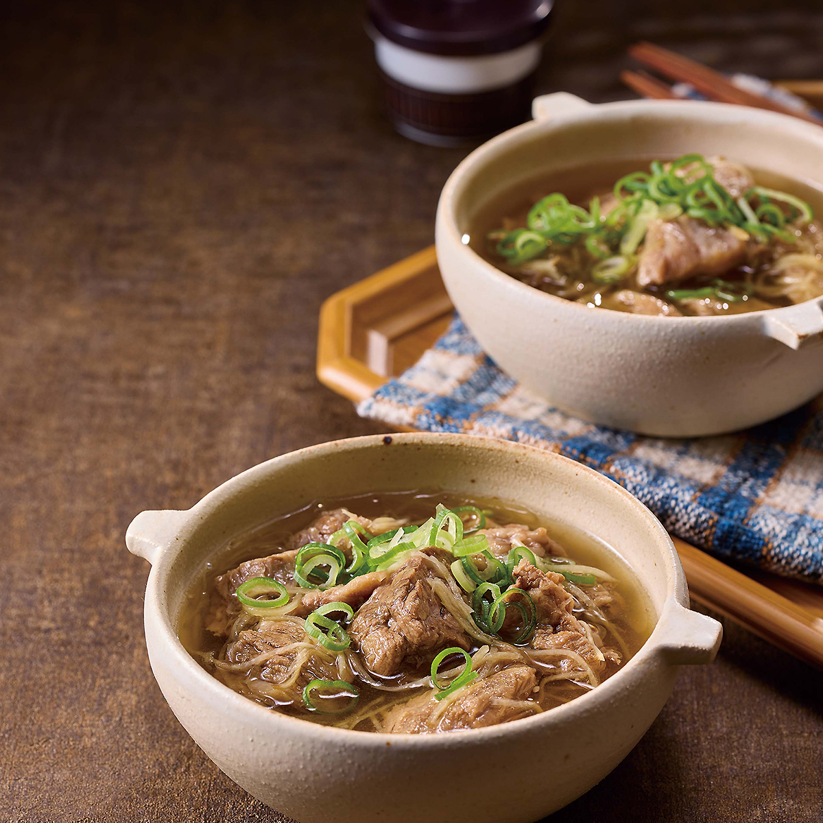 大阪難波発祥のソウルフード「肉すい」は、黒毛和牛の牛すじの旨みと生姜の風味が調和した一品です。簡単調理できるので、忙しい日常でも手軽に本格的な味を楽しめます。※画像はイメージです。