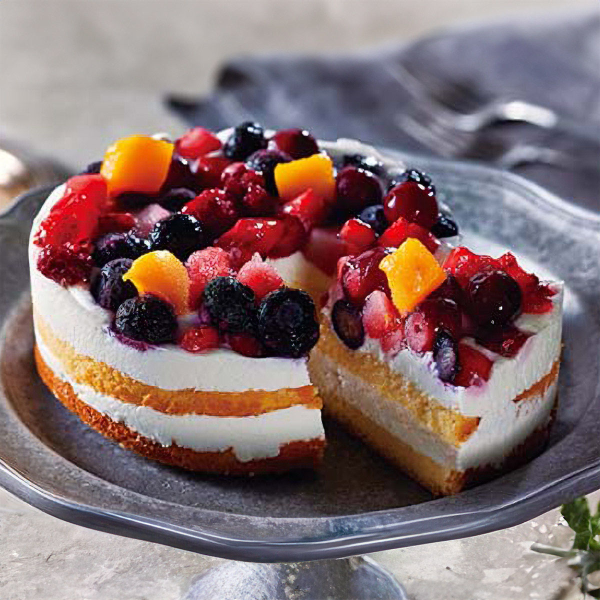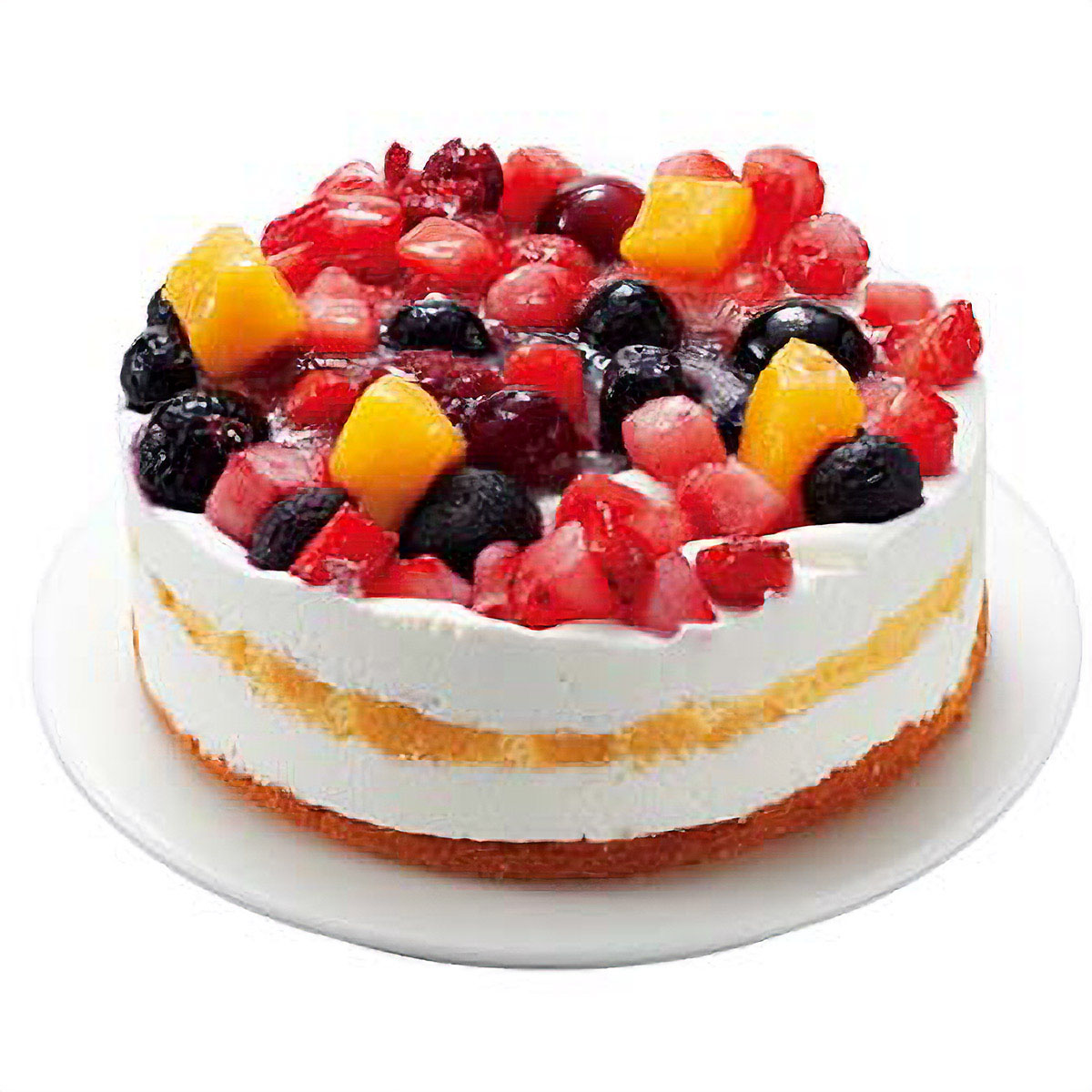 彩り鮮やかなフルーツケーキ。4種のベリーと黄桃をたっぷりトッピングした華やかなフルーツケーキです。プレーンスポンジにカスタードを加えたクリーミーなホイップクリームをサンドしました。優しく広がるフルーツの爽やかな酸味とクリームの甘みをお楽しみください。