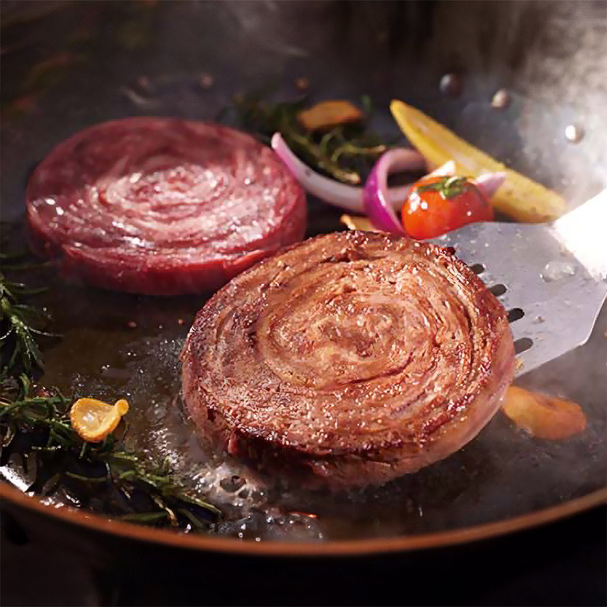 国内産黒毛和牛の薄切り肉をロール状に巻き上げ、ステーキ風にカットしました。黒毛和牛特有の旨味をミックススパイスがさらに引き立てます。
