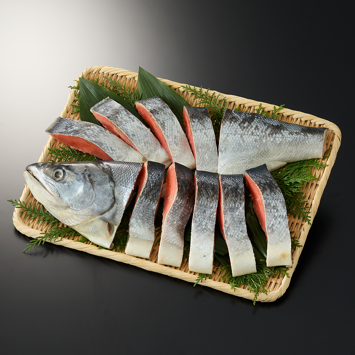 北海道道東近海で獲れる新鮮な秋鮭を使用。粗塩を丹念にすり込み、半身姿造りの切身にしました。※画像はイメージです。