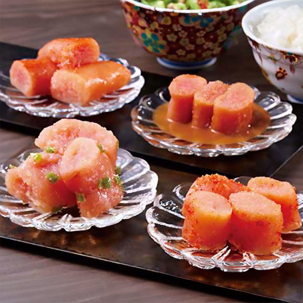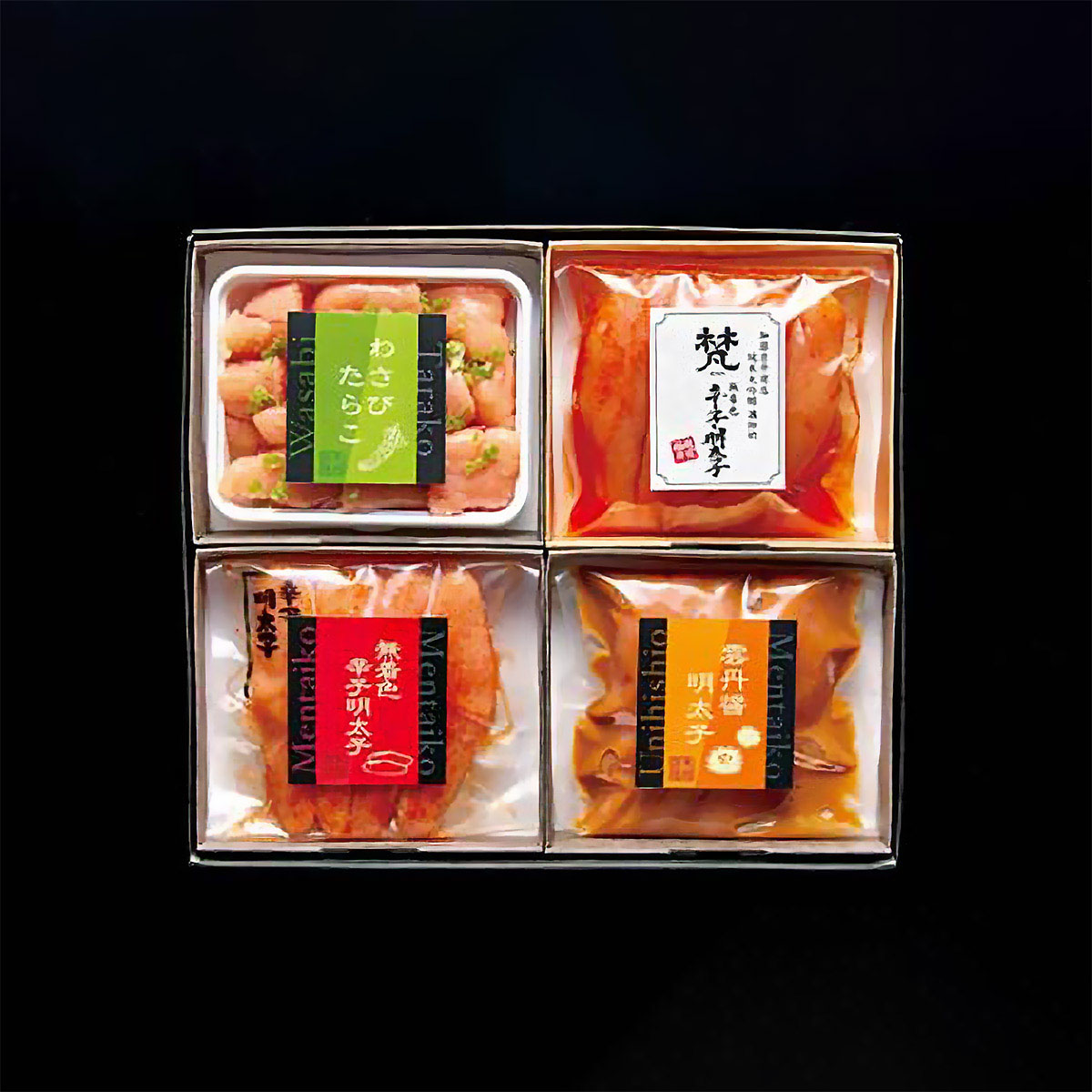 ●内容:雲丹醤めんたい120g、わさびたらこ200g、大吟醸「梵」入り明太子160g、無着色辛子明太子150g●商品に含まれるアレルギー特定原材料8品目:なし●アルコール使用:あり●賞味期限:冷凍60日※お届け日、お届け時間のご指定は承れません。※ご注文からお届けまで10日前後いただいております。>>全国うまいもの巡り 商品一覧