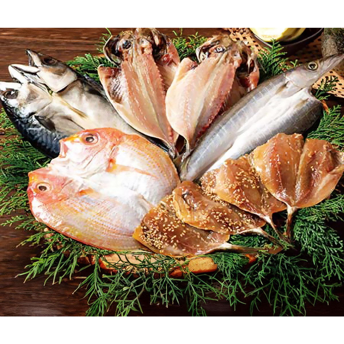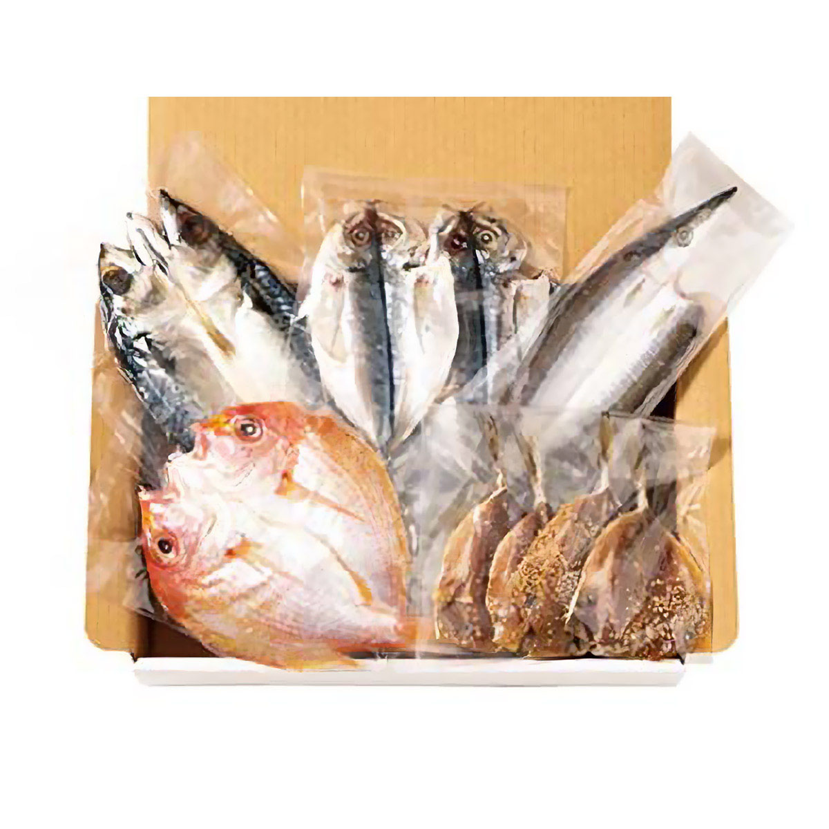 九州産の原料を手早く捌きひと塩をして味付け、1枚1枚じっくりと丁寧に干し上げ旨みを凝縮させた干物に仕上げました。干物とみりん干し5種類をバランス良く詰合せたセットです。