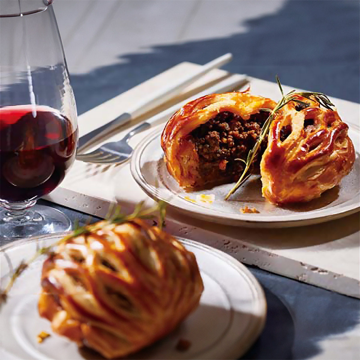 華やかな風味がひろがる。ローストビーフ専門店が作り上げた、濃厚な味わいと香りのミートパイです。ふんだんに使用した牛肉と長時間煮込んだ野菜の甘みがぎゅっと詰まったボロネーゼに黒トリュフを合わせ、パイ生地で包み込み香りと旨味を閉じ込めました。サクサクとした焼き立ての食感をそのままに、超冷凍技術を使用してお届けします。