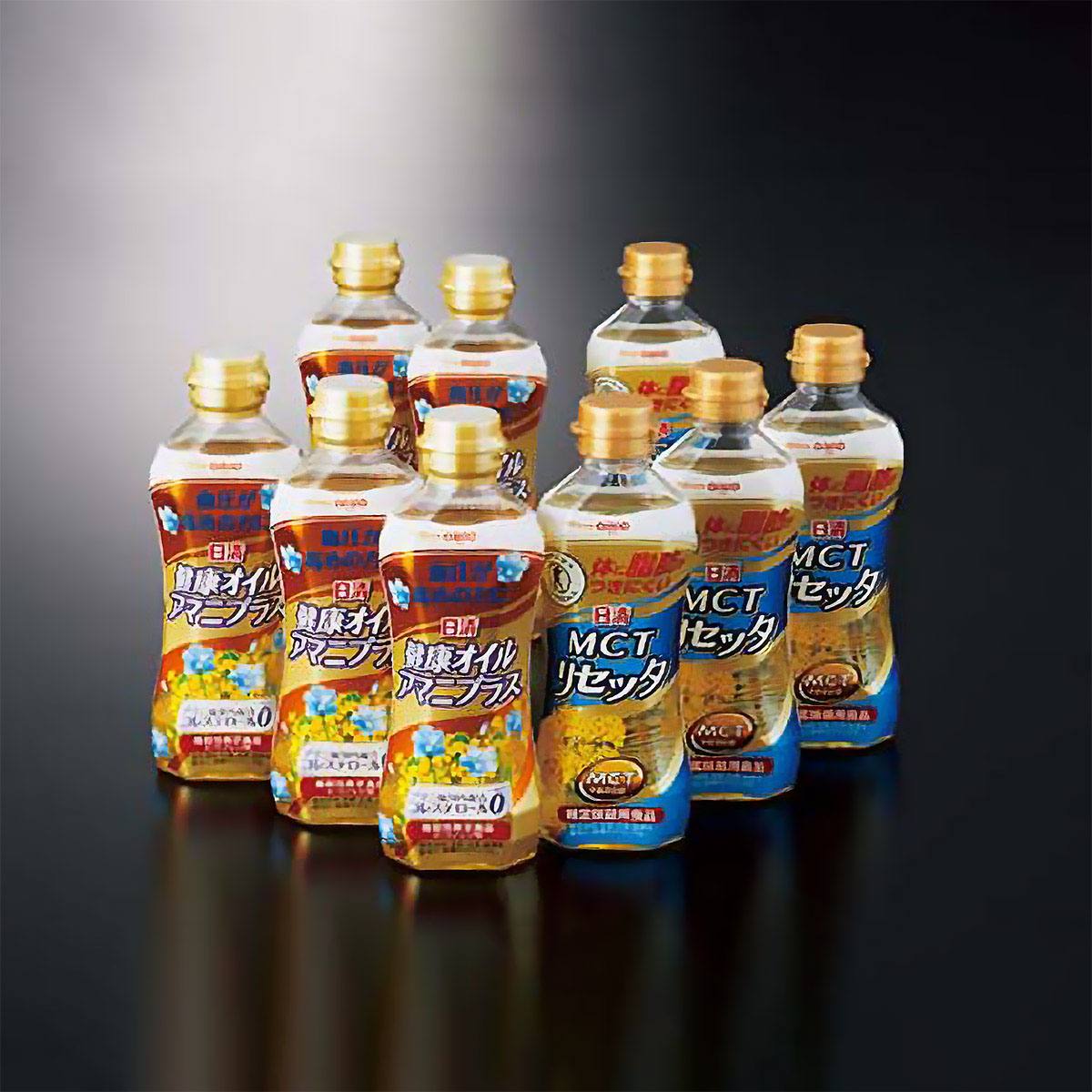 血圧が高めの方におすすめの機能性表示食品、アマニ油を約30%配合した健康オイルアマニプラスと、体に脂肪がつきにくい特定保健用食品MCTリセッタ。加熱調理から生食までどんなお料理にもお使いいただける、健康オイルのセットです。
