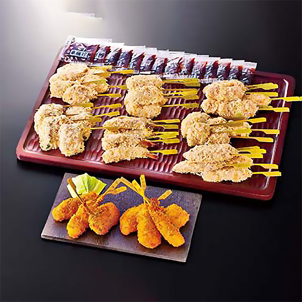 選び抜いた食材を串にさし生パン粉を付けた後急速冷凍して大阪の本社工場から直接ご自宅にお届け致します。ご家庭で揚げたての串揚げをお楽しみください。