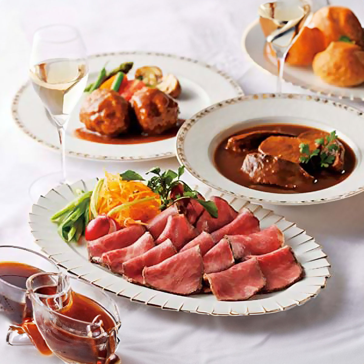 1991年に大阪で開店した本格的フレンチを楽しめる「ノワ・ド・ココ」清水シェフプロデュース。黒毛和牛A4ランクロースのローストビーフ、通常の輪切りではなく、大胆に縦にカットして4時間煮込んで専用ソースをなじませたとろける牛たんシチュー、こだわりのデミグラスソースでいただく黒毛和牛をベースにしたハンバーグが楽しめるプレシャスセットです。