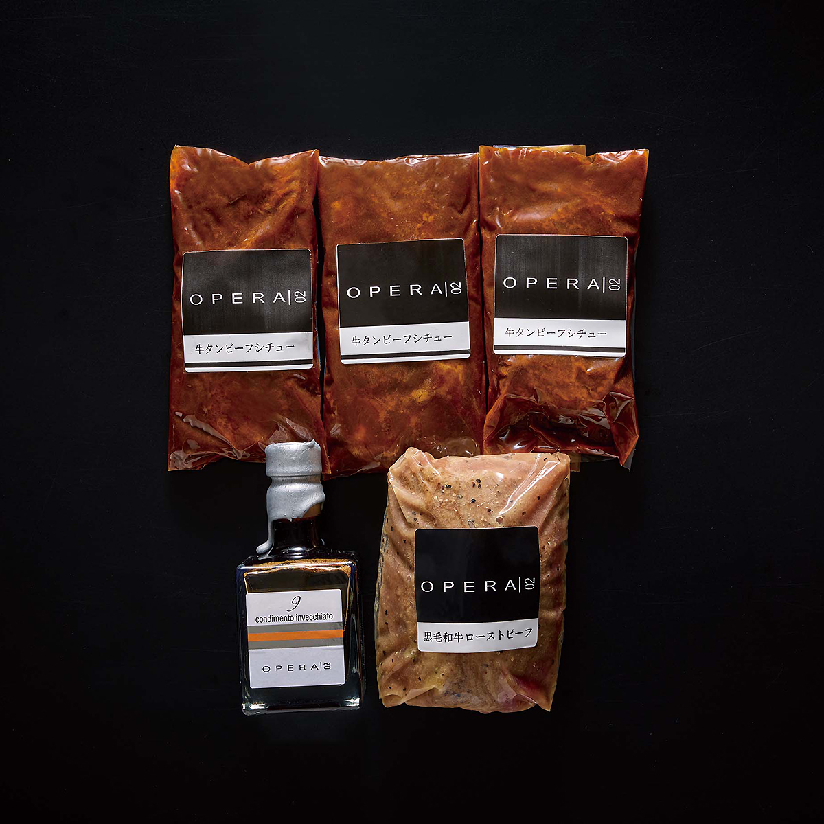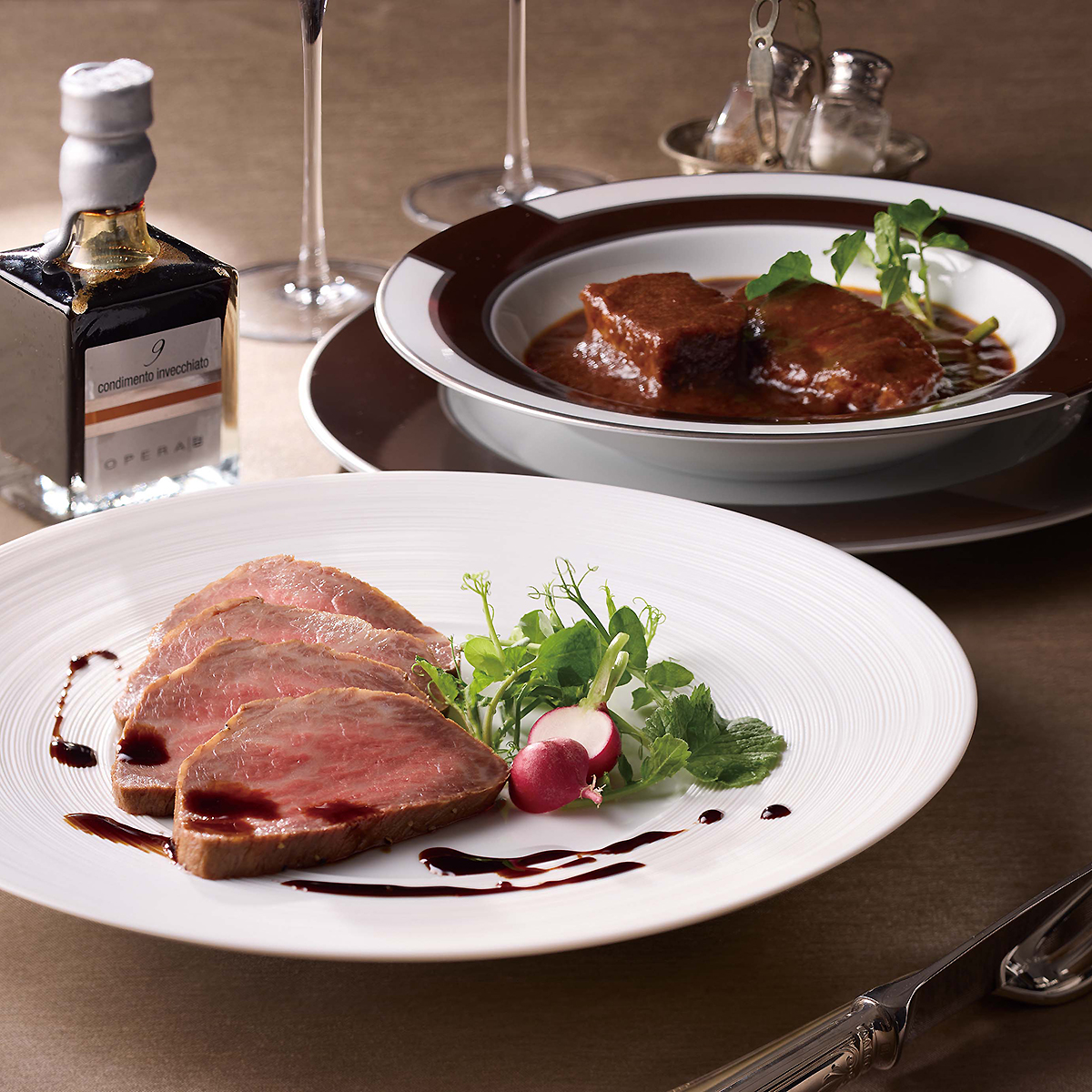9年の歳月をかけ芳醇な香り、酸味、甘みの調和の取れた熟成バルサミコ酢で味わう黒毛和牛ローストビーフ、濃厚で旨みある牛タンを野菜の旨みが溶け込んだソースでじっくり煮込んだコク深い味わいのビーフシチューのセットです。※画像はイメージです。