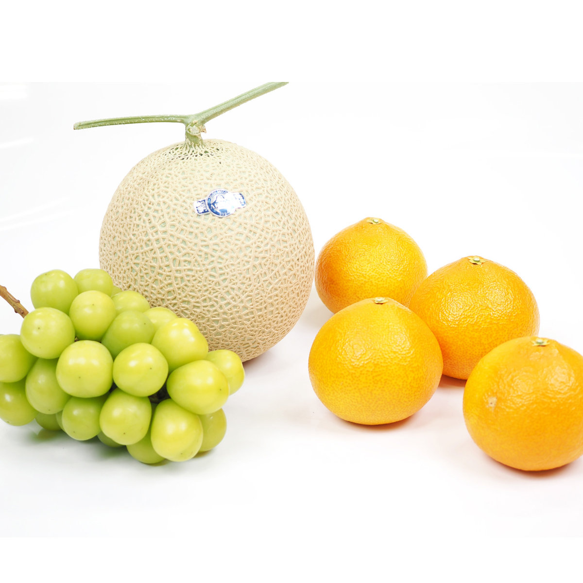 ●内容:静岡県産マスクメロン 1玉(約1.2kg)、愛媛県産紅まどんな 5玉(計約1.2kg)、長野県産他シャインマスカット 1房(約450g)
