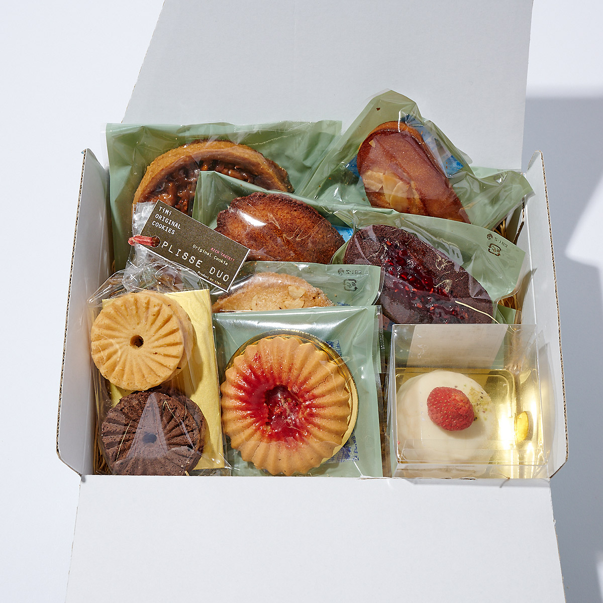 ●内容:ナッツタルト、ピーナッツチョコチップクッキー、ロシアスフレーズ、蜂蜜マドレーヌ、フィナンシェ、フィナンシェショコラ、ガレットブルトンヌゲランド、プリッセデユオ、ビスキュブショート