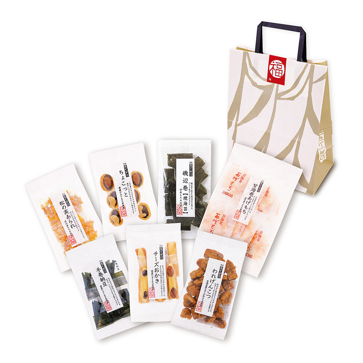 ●内容:甘えびあげもち8枚、われげんこつ72g、手巻納豆6個、チーズおかき6本、松の実あられ24g、磯辺巻 焼海苔30g、ちょこっと6個