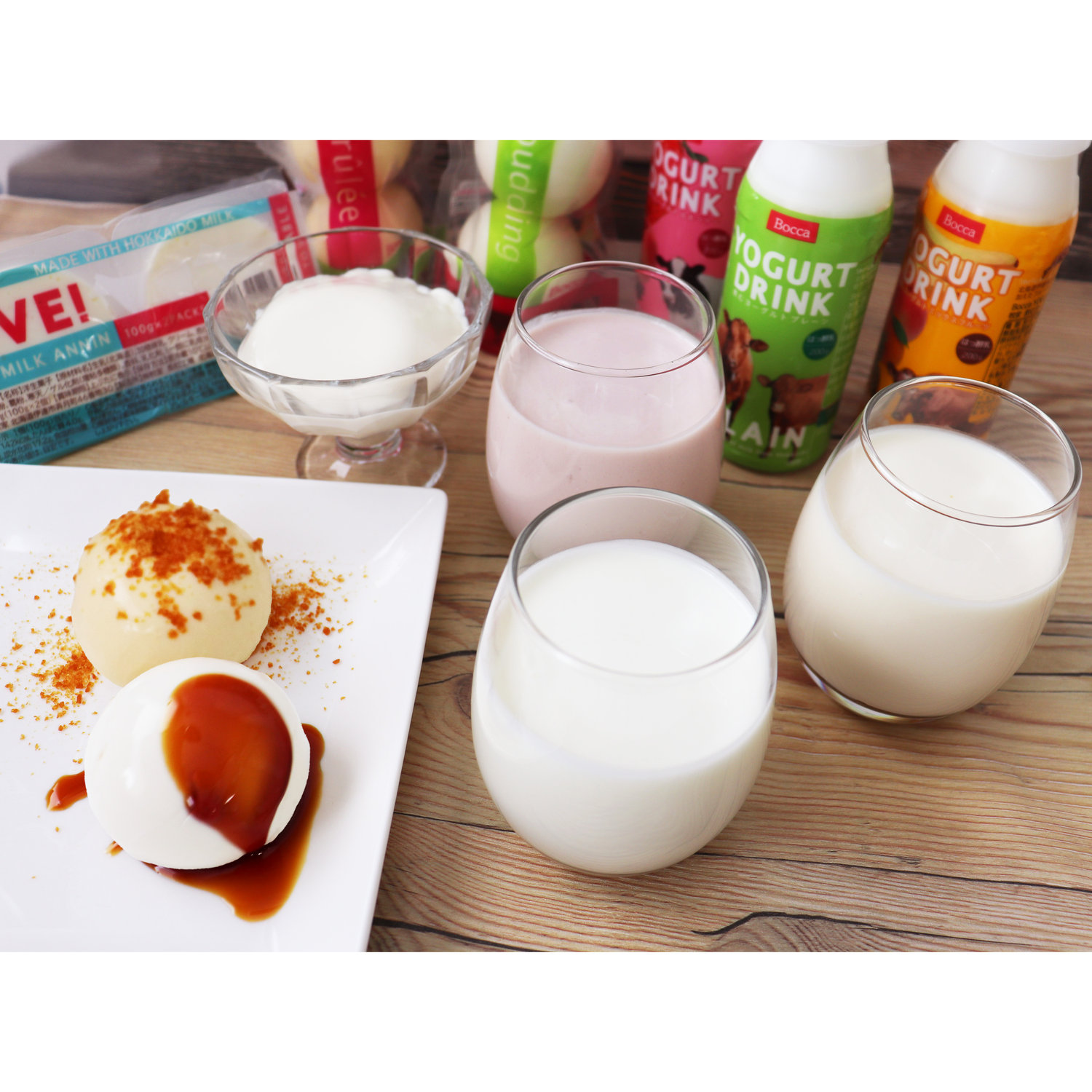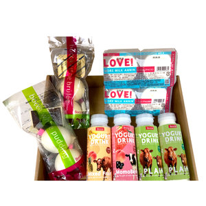 ●内容:白いプリン2個入、クレームブリュレ2個入×各1個、杏仁豆腐200g×2個、飲むヨーグルトプレーン200g×2本、飲むヨーグルトももべりー200g、飲むヨーグルトミックスフルーツ×各1本