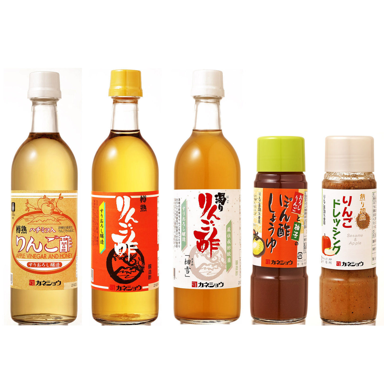 ●内容:ハチミツ入りんご酢500ml×2本、樽熟りんご酢500ml×1本、濁りりんご酢「細雪」500ml×1本、りんごと柚子のぽん酢しょうゆ200ml×1本 煎り胡麻りんごドレッシング212g×1本