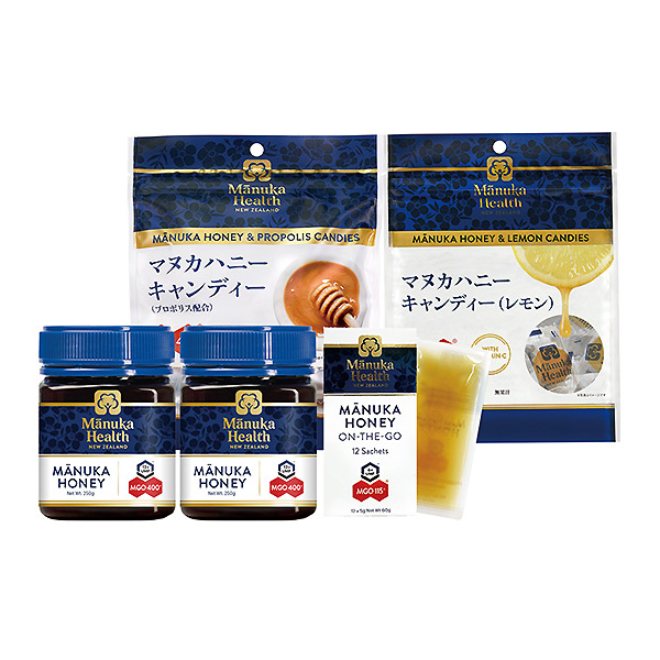 ●内容:マヌカハニーMGO400+(プラス) 250g×2、マヌカハニーキャンディ(プロポリス)80g、マヌカハニーキャンディ(レモン)80g、マヌカハニーMGO115+(プラス)スナップパック(5g×12個)