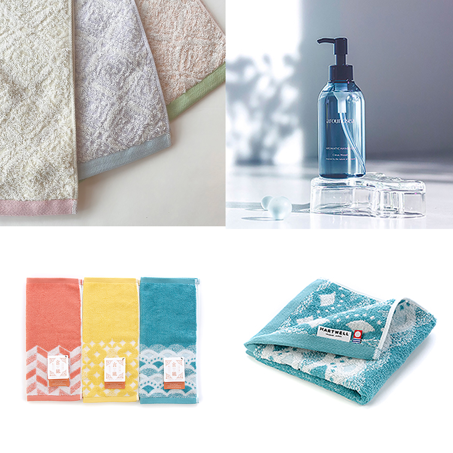 バスタオル2枚、おしぼりタオル2枚にハンドソープが付いたお得なセットです。
