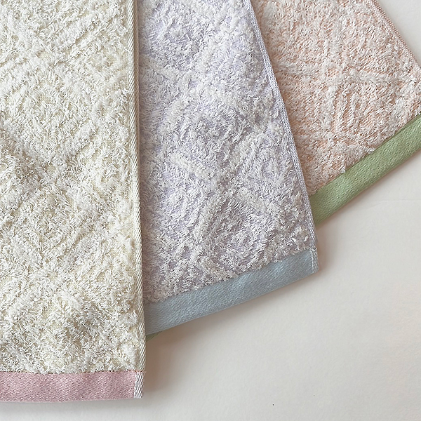 やわらかな色合いでまとまった柄タオルです。ヘムに差し色を配置し、良いアクセントに仕上がりました。