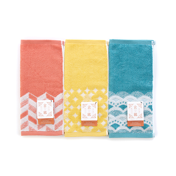 日本の伝統的な文様であり、縁起がいいとされる吉祥文様のなかでも、贈り物に最適な意味を持つ3柄をモダンに描いてギフトタオルに仕立てました。柄に変化を出すため、模様に一部にパイルの出ない『落とし』といわれる表現技法を採り入れて立体感を出しています。