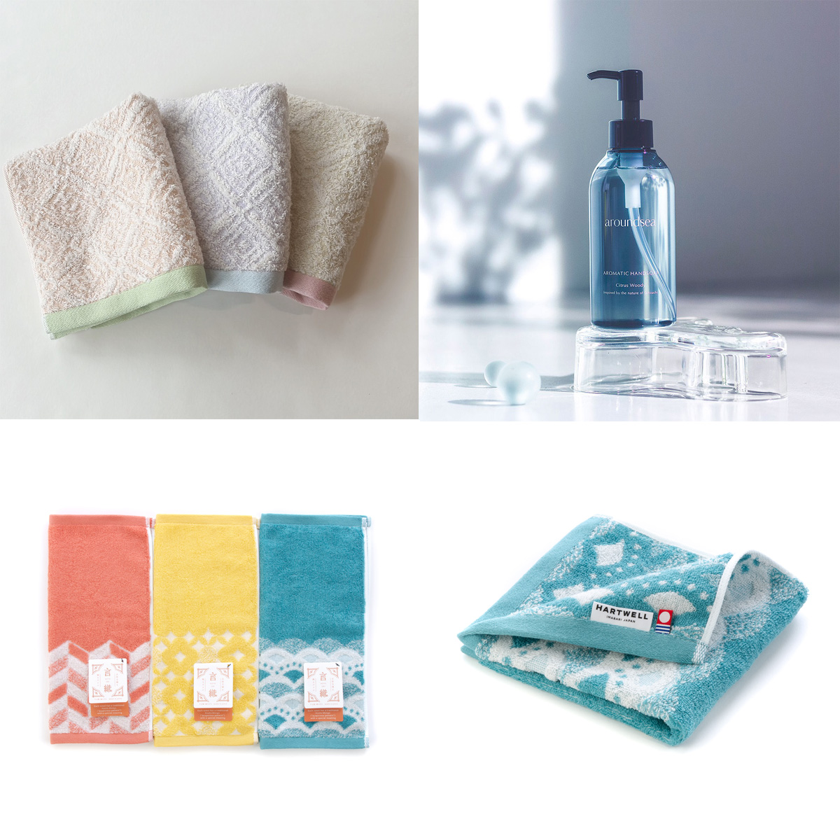 フェイスタオル2枚、おしぼりタオル2枚にハンドソープが付いたお得なセットです。