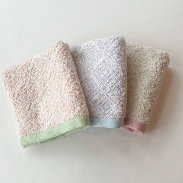 やわらかな色合いでまとまった柄タオルです。ヘムに差し色を配置し、良いアクセントに仕上がりました。