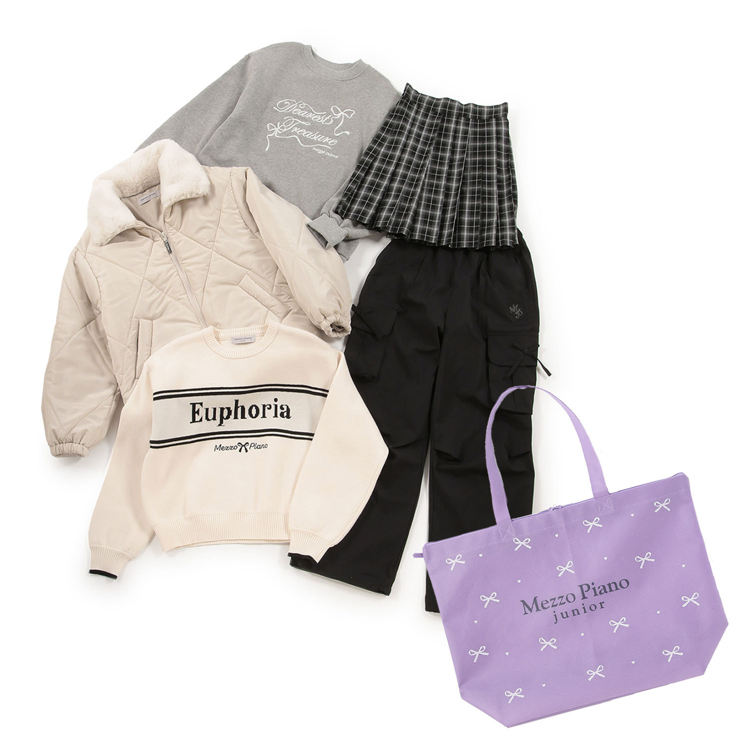 メゾピアノジュニアのカジュアルコーデが楽しめる5点セットです。ふんわりとしたボリューム感のあるフェイクファー襟付き中わたジャケットは、軽やかな着心地ながらあたたかく、デイリーにもお出かけにもぴったりの万能アウター。トップスには、大きめロゴが印象的なジャカードニットと、筆記体ロゴがロマンティックな裏起毛トレーナーをご用意。どちらもトレンド感と着心地の良さを兼ね備えています。ボトムには、モノトーンチェックのプリーツスカパンでスクールガール風に、スポガーリーな雰囲気の2WAYカーゴパンツでカジュアルガーリーに、と気分に合わせて幅広い着こなしを楽しめます。毎日のコーディネートがぐっと楽しくなる、バリエーション豊かな福袋です。