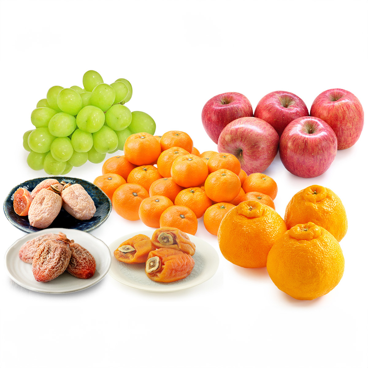 年の初めにふさわしい豪華な詰め合わせです。りんご約2kgとみかん約2kgは、家族で楽しむ定番の甘み。そこに香り高いデコポン3玉を加え、柑橘の魅力をさらに引き立てました。さらに市田柿200gとあんぽ柿180g×2パック、富山干柿約60g×4個を盛り込み、日本のお正月らしい「和の甘み」をしっかりと表現。そして、セットの中心にはシャインマスカットを1房。粒張りの良さと上品な甘さは、初売りの目玉にふさわしい存在感です。柑橘の爽やかさ、りんごの甘酸っぱさ、干柿の濃厚な甘み、そしてマスカットの華やかさ。すべての味わいが重なり合うことで、贈る人にも贈られる人にも特別な一年の始まりを感じていただける内容になっています。
