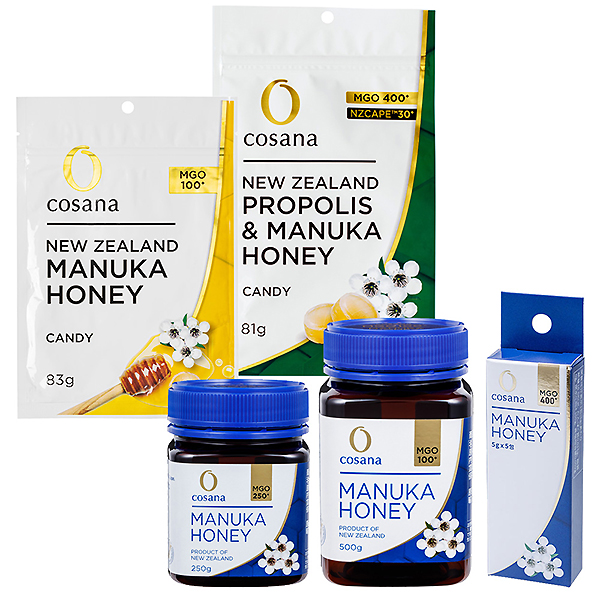 ニュージーランドにのみ自生するマヌカの花から採取したハチミツ。他のハチミツには無い独特の香りとコク、そして群を抜いて多い、天然の生成物(MGO)が最大の魅力です。MGO100+(500g)、MGO250+(250g)、分包タイプのMGO400+、マヌカハニーキャンディ、プロポリス入りのど飴の5点をセットにいたしました。