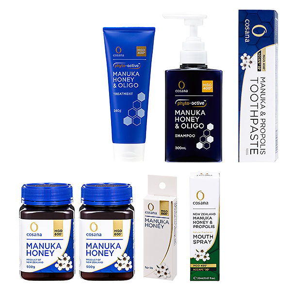 ニュージーランドにのみ自生するマヌカの花から採取したハチミツ。他のハチミツには無い独特の香りとコク、そして群を抜いて多い、天然の生成物(MGO)が最大の魅力です。その中でもトップクラスのMGO600+(500g)を2個、さらに希少なMGO1000+の分包、その他にもマヌカハニーを配合したプロポリススプレー、シャンプー、トリートメント、歯磨きを全て詰め合わせました。