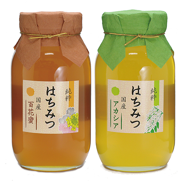 国産はちみつは養蜂家の手で大切に採蜜された貴重な自然の恵みです。自然のままの香りと風味をそのまま瓶に閉じ込めました。純粋なはちみつ100%のやさしい甘さをお楽しみください。花々の調和が楽しめる百花と、すっきりとした甘さのアカシア。気分や料理に合わせて選べる、彩り豊かな組み合わせです。