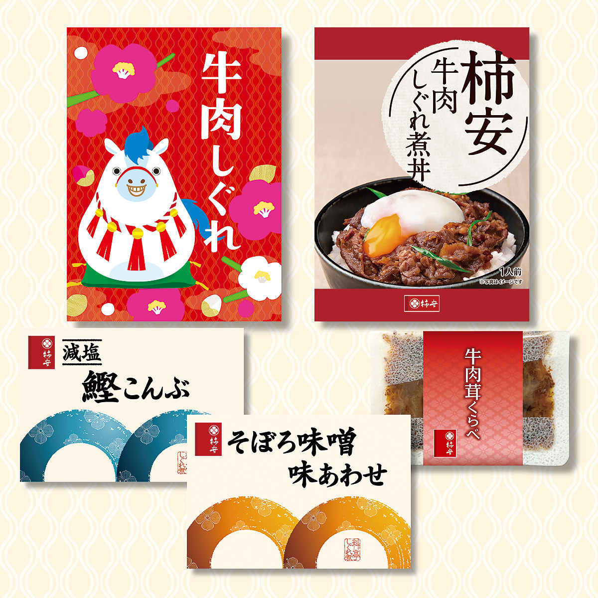●内容:牛肉しぐれ 福袋限定(50g)、牛肉しぐれ煮丼(115g)、牛肉茸くらべ(40g)そぼろ味噌味あわせ(90g)、減塩鰹こんぶ(50g)