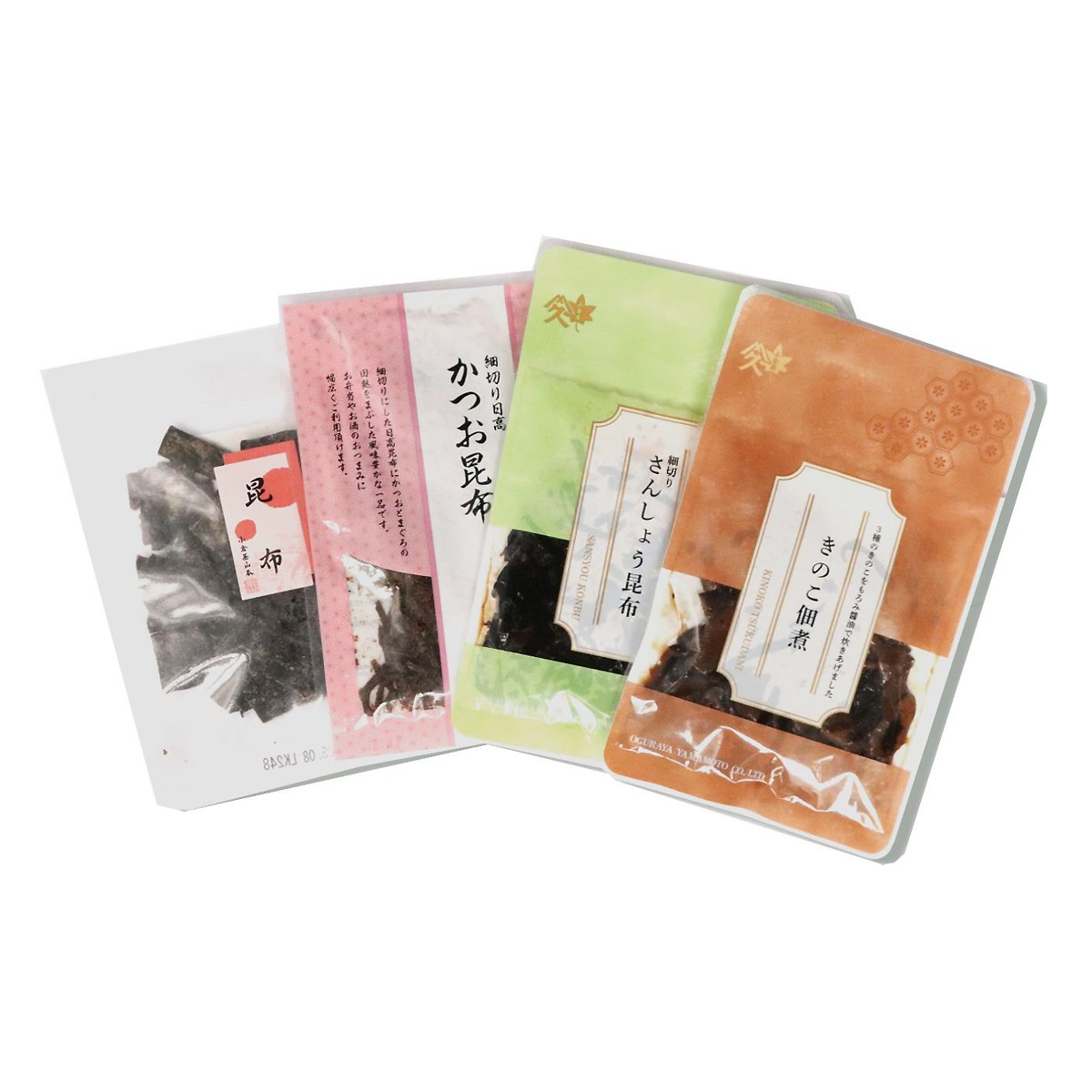 ●内容:塩昆布(60g)、かつお昆布(60g)、さんしょう昆布(55g)、きのこ佃煮(65g)