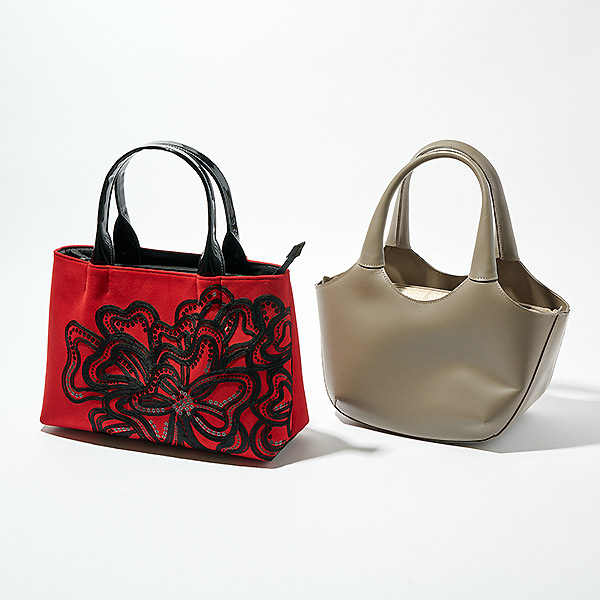 ●素材:レッド:本体 ポリエステル生地/手紐等 エナメル(合成皮革) ※装飾部分 ポリエステルコード紐・スパンコール、スモーク 牛革